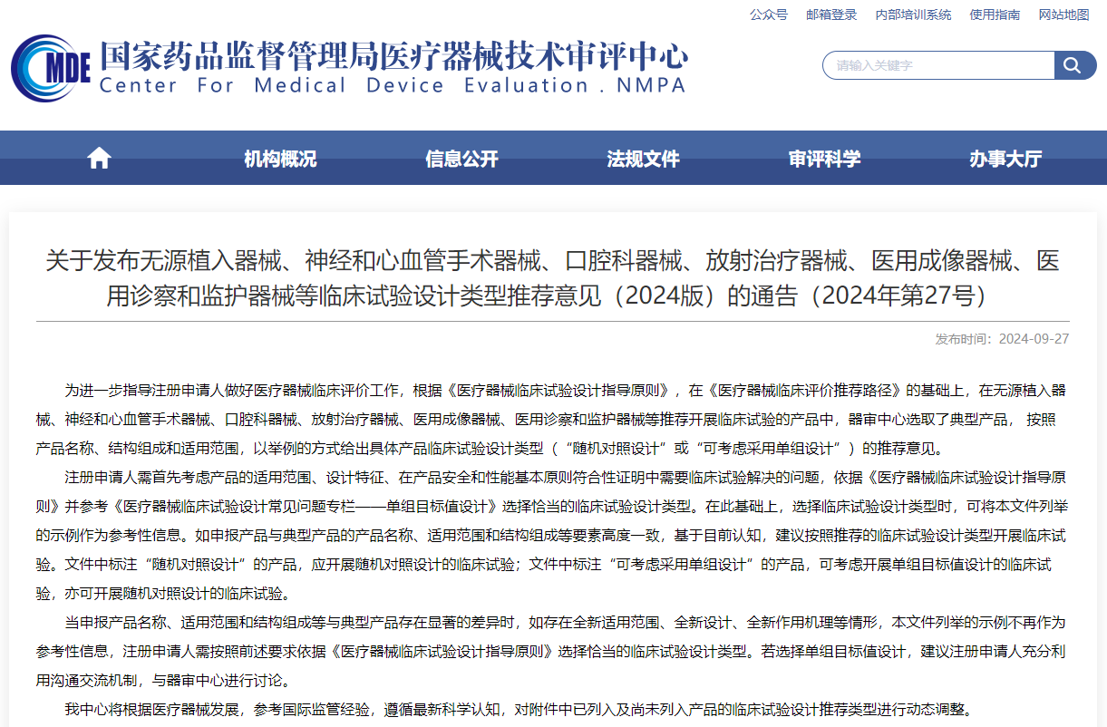 無源植入器械、神經和心血管手術器械、口腔科器械、放射治療器械、醫用成像器械、醫用診察和監護器械等臨床試驗設計類型推薦意見近日,器審中心發布《無源植入器械、神經和心血管手術器械、口腔科器械、放射治療器械、醫用成像器械、醫用診察和監護器械等臨床試驗設計類型推薦意見(2024版)的通告》。