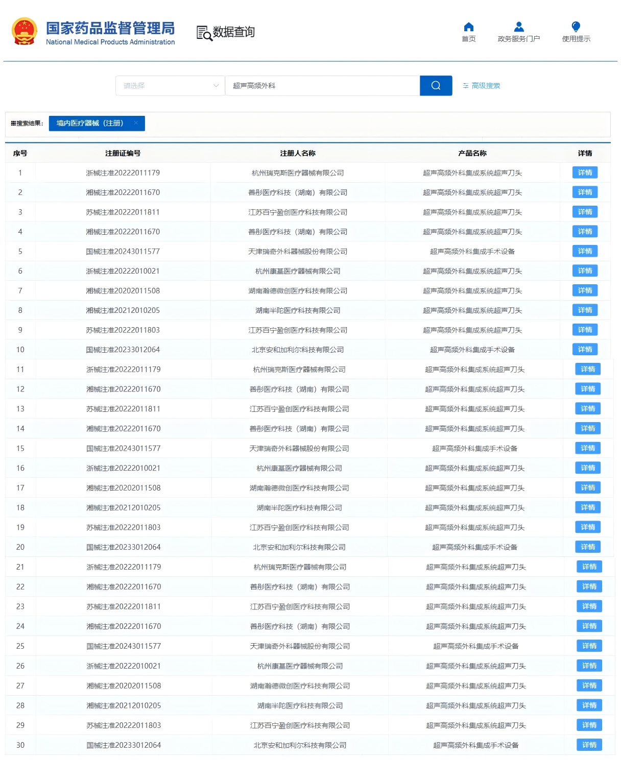 ● 2024年8月,賽諾微醫療科技自主研發的一次性使用超聲高頻外科集成手術設備超聲刀頭產品獲得NMPA批準上市,系中國第一把獲批上市的國產7mm超聲刀。