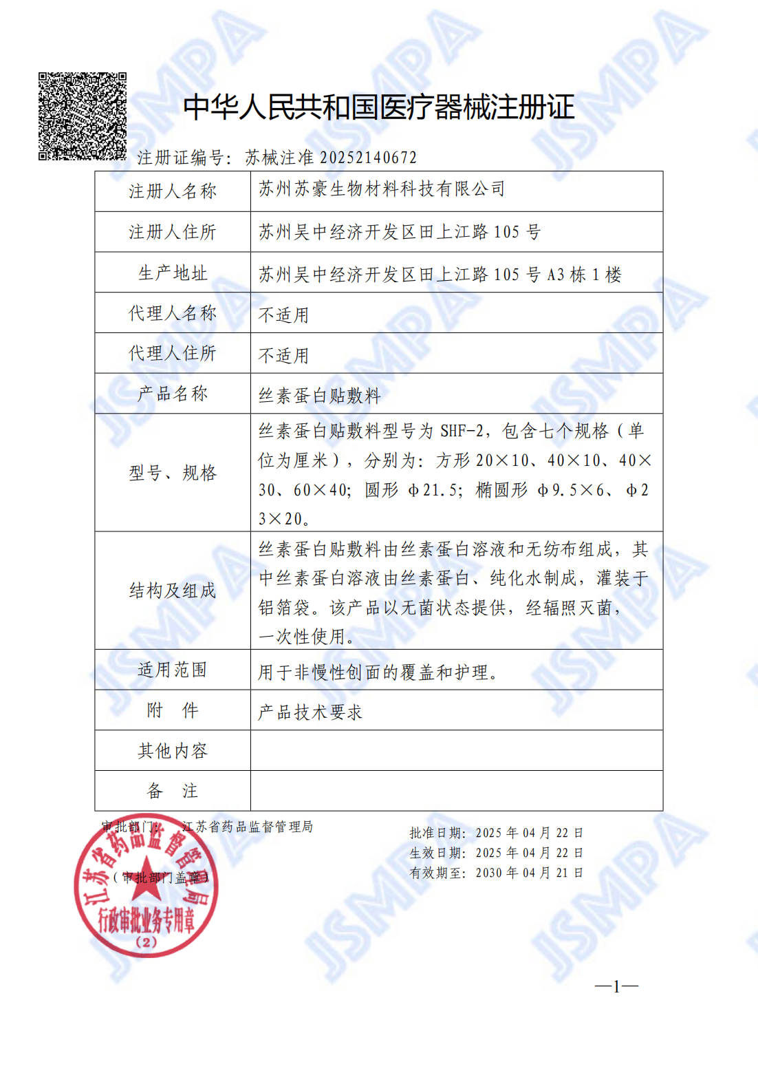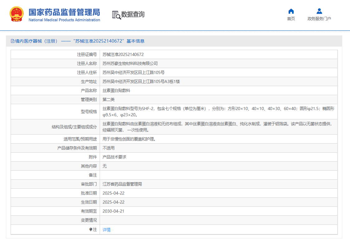 喜訊?????????奧泰康蘇州CDMO中心研發的「絲素蛋白貼敷料」獲國家藥監局批準上市2025年4月22日,經國家藥品監督管理局公示,奧泰康蘇州CDMO中心研發的絲素蛋白貼敷料(蘇械注準20252140672)獲得NMPA批準上市,產品獲批國家第二類醫療器械注冊證。