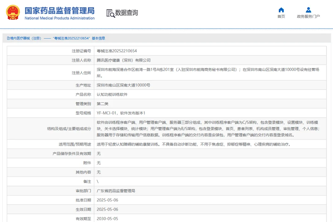 近期,經國家藥品監督管理局公示,騰訊醫療健康(深圳)有限公司自主研發的認知功能訓練軟件(粵械注準20252210654)獲得NMPA批準上市,奧泰康提供MA解決方案。